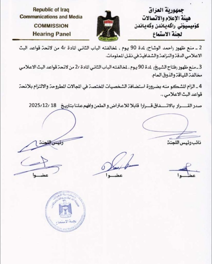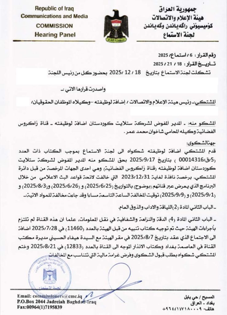 هيئة الإعلام والاتصالات تعاقب قناة زاكروس بغرامة مالية وتقييد الظهور الإعلامي