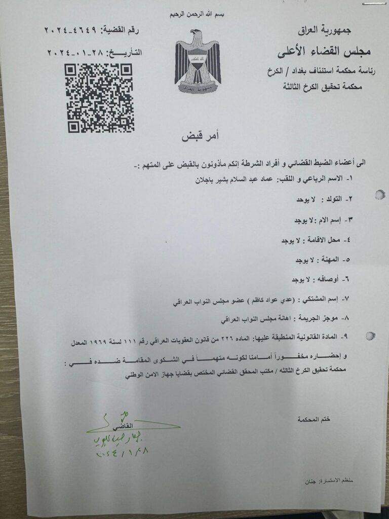 بالوثيقة …القضاء الأعلى يصدر أمر إلقاء القبض بحق عماد باجلان