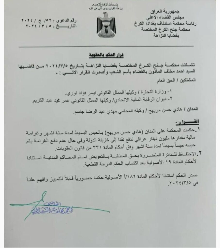 حكماًبالحبس البسيط لمدة 6 أشهر وغرامة مالية مقدارها مليون دينار عراقي، وفق أحكام المادة (331) من قانون العقوبات”