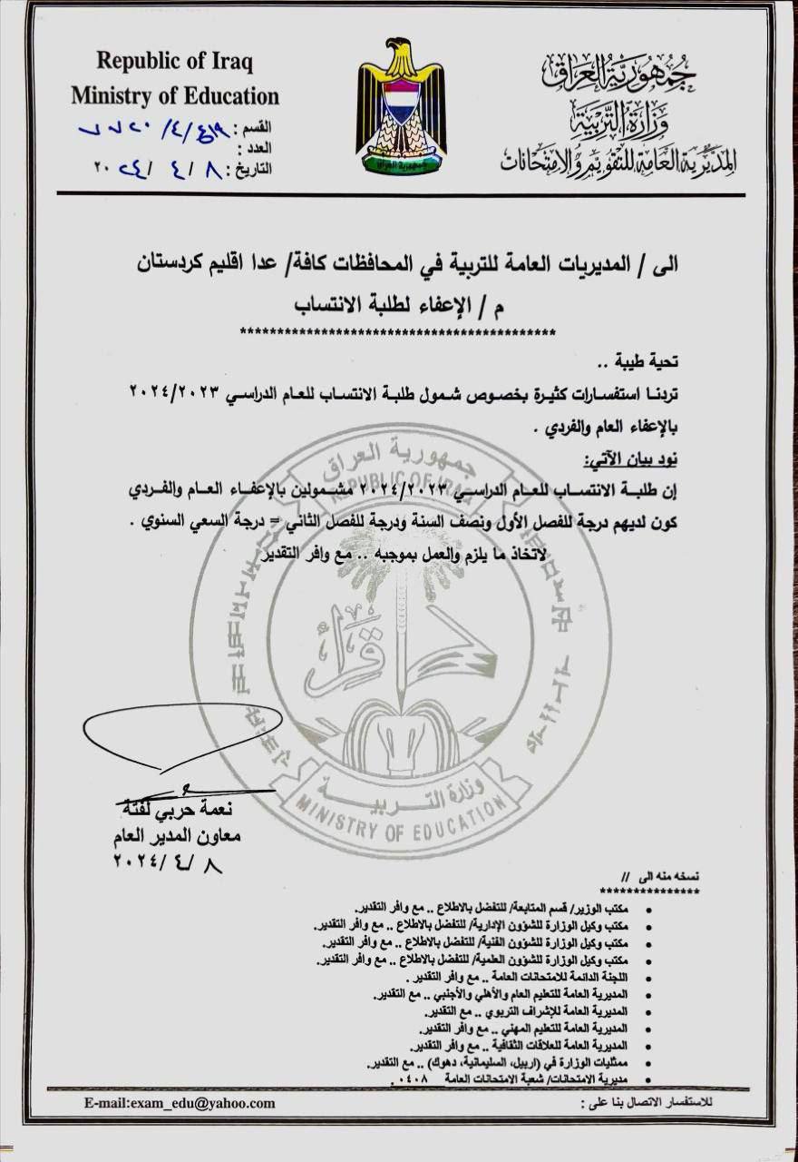 وزارة التربية المديرية العامة للتقويم والامتحانات تؤكد  شمول طلبة الانتساب بنظام الإعفاء العام والفردي للعام الدراسي ٢٠٢٣_٢٠٢٤