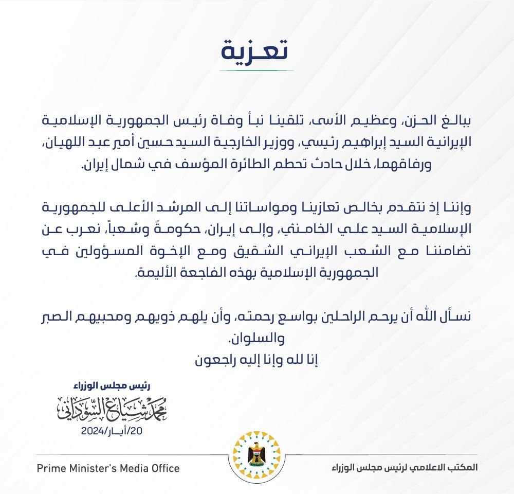 رئيس الوزراء يعزي الحكومة الإيرانية وشعبها بحادثة وفاة رئيسي ومرافقيه
