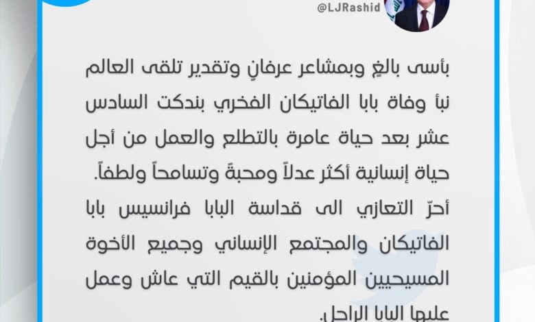 واضاف “أحر التعازي الى قداسة البابا فرانسيس بابا الفاتيكان والمجتمع الانساني وجميع الاخوة المسيحيين المؤمنين بالقيم التي عاش وعمل عليها عليها البابا الراحل”.