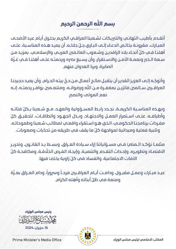 رئيس الوزراء يجدد العهد في عيد الأضحى بتحقيق مفردات البرنامج الحكومي