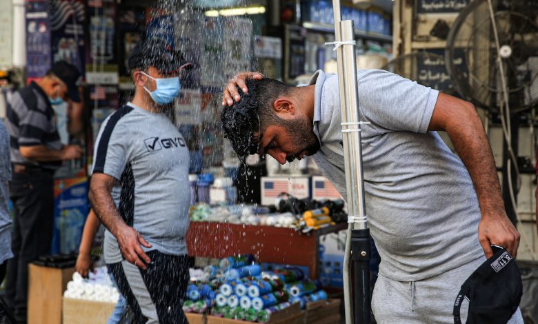 A man stands underneath a roadside shower along Sinak street in Iraq's capital Baghdad on August 9, 2020, to cool off due to extremely high temperature rises amidst a heatwave. (Photo by AHMAD AL-RUBAYE / AFP) (Photo by AHMAD AL-RUBAYE/AFP via Getty Images)