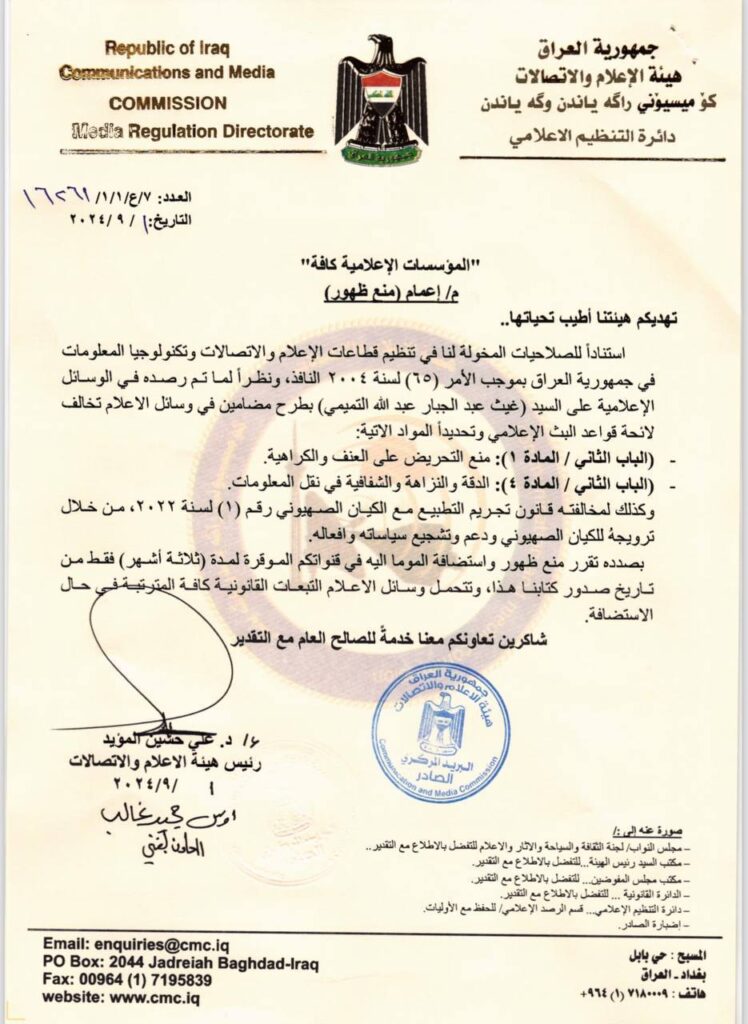 بالوثيقة …هيئة الإعلام والاتصالات تقرر منع ظهور غيث التميمي على وسائل الإعلام لمدة 3 أشهر لمخالفته القانونية