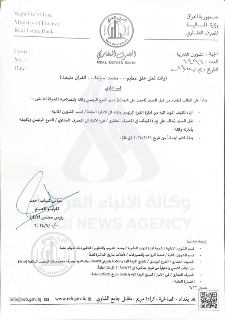 أنهى المصرف العقاري، اليوم السبت، تكليف مدير فرعه الرئيسي أحمد علي شحاذة بناءً على طلبه وتكليف خالد علي زيد بديلا عنه.