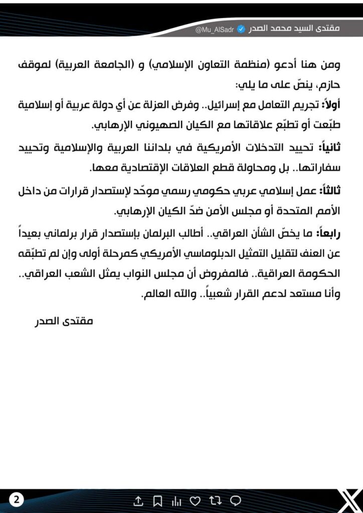 السيد الصدر يدعو الجامعة العربية لفرض العزلة على إسرائيل